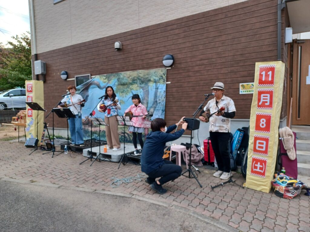 食欲の秋にピッタリな飲食物やお芋をからめたツル巻きレース・サツマイモの重さ当てゲーム等アトラクションを楽しみ、お祭りらしい賑やかな雰囲気の中、最後はいっぱいさんの三線の音色に合わせて「涙そうそう」「島人の宝」の歌声が響き渡る素敵なクライマックスとなりました。