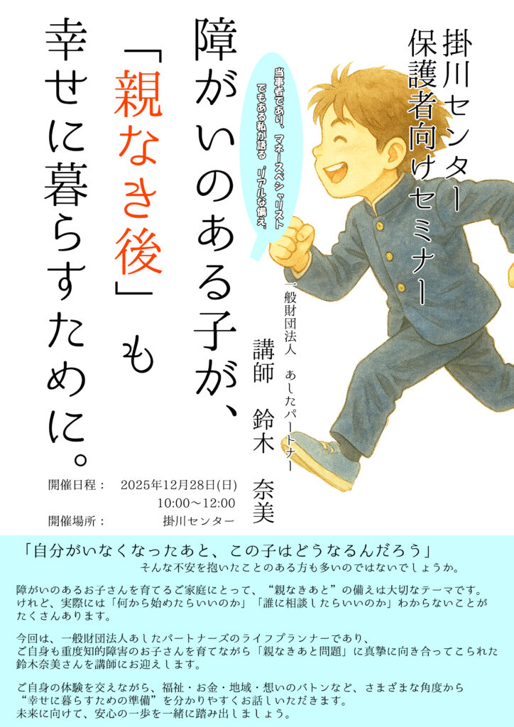 この度、放課後等デイサービス 掛川センターでは、”親なきあと”をテーマにした保護者向けセミナーを開催いたします。