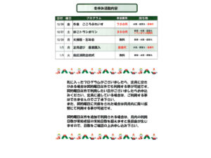 | 開所日・開所時間 | 月曜日~土曜日(祝日・年末年始除く) 平日:学校終了時~17時 学校休業日、長期休暇:10時~16時 上記を基本とし、時間は応相談となります。 |